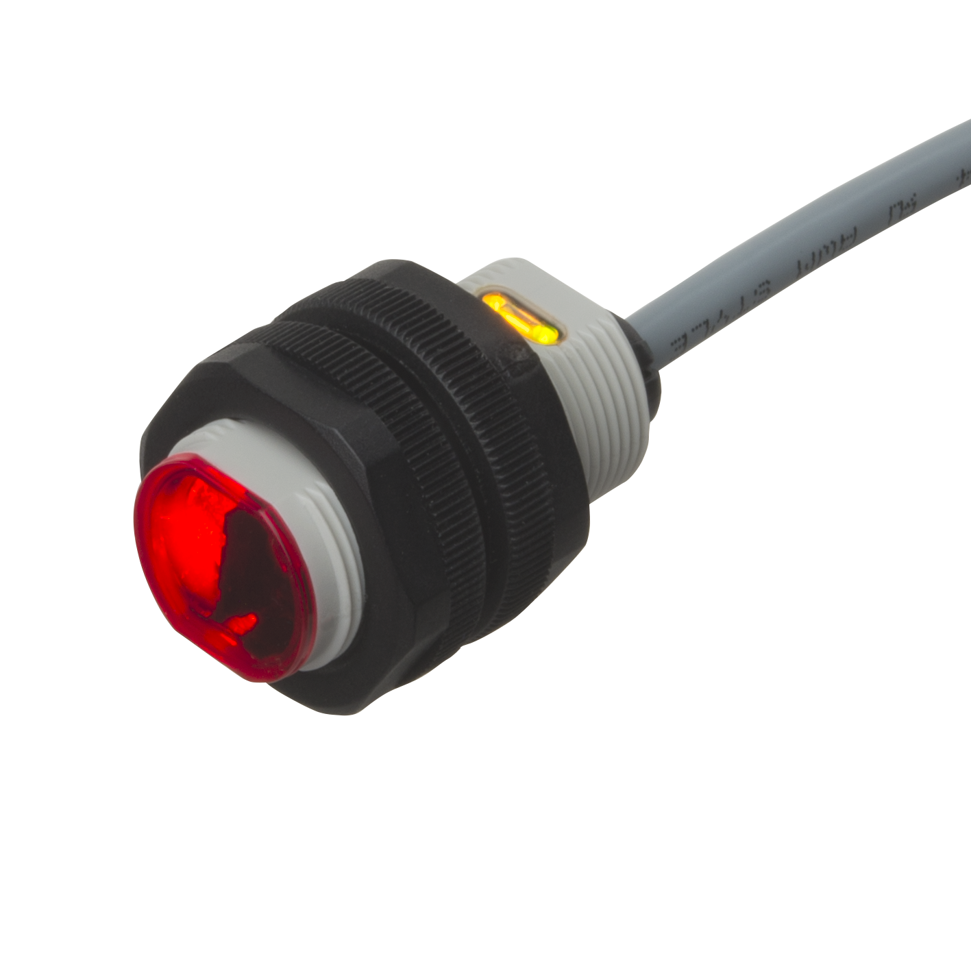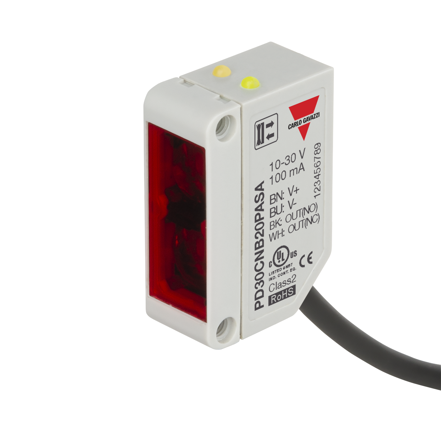 Diffuse-reflective Photoelectric Sensor with Adjustable Background Suppression, Range: 0-200mm, Polarity free red light 625nm, Power Supply 10-30VDC, PNP Output, N.O. and N.C., light and dark switching, Cable connection, 10x30x20mm housing